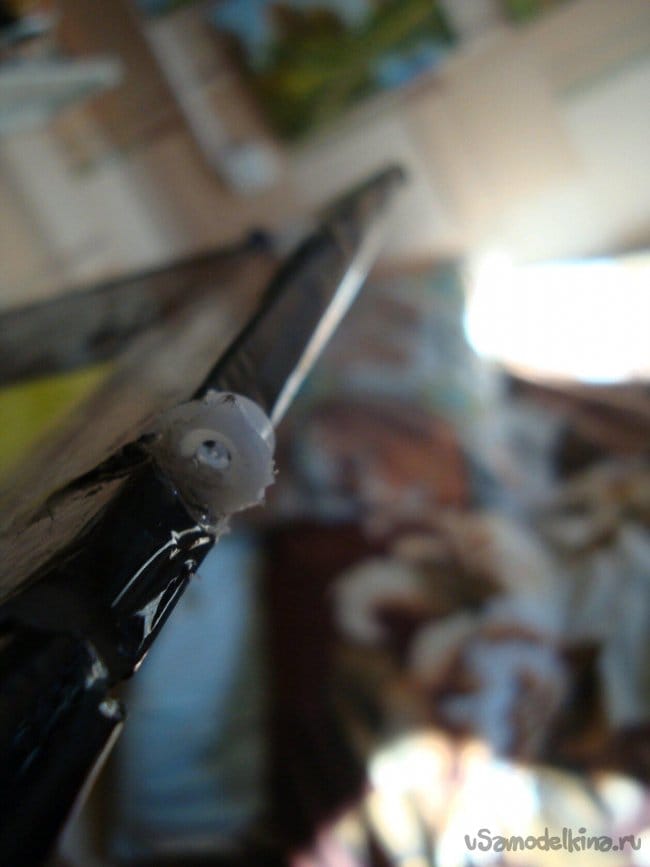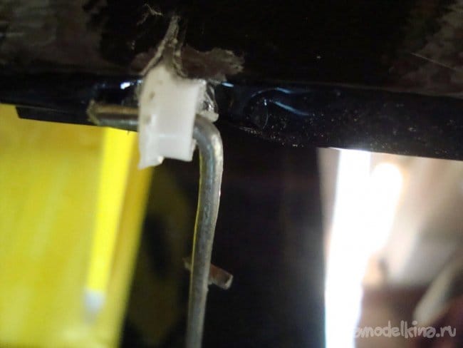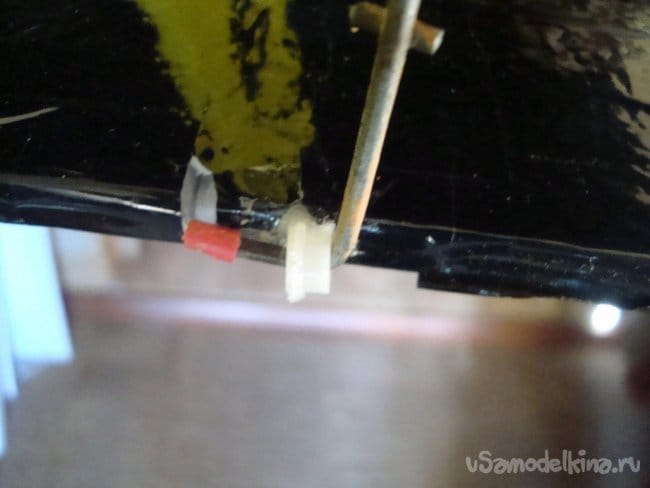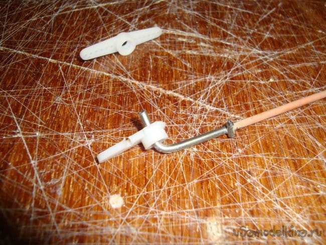 При монтаже соединительных тяг между элеронами нижнего и верхнего крыла использовал половинки качалок от сервоприводов, вклеивая их в элероны. Само тяги сделал из проволоки диаметром 2 мм.