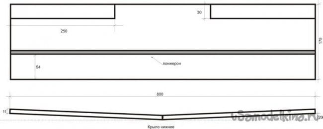 Начал работу с самого сложного элемента конструкции, нижнего крыла. Сложность заключалась в том, что крыло имеет V угол и разделено посредине горизонтальной плоскостью. Оно состоит, как бы из трёх частей.