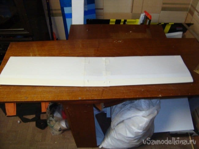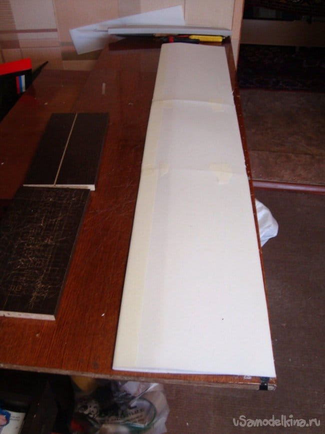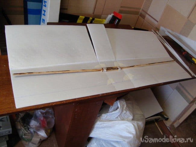 С верхним крылом всё было намного проще - оно прямое. В качестве лонжерона я использовал полоски потолочной плитки.