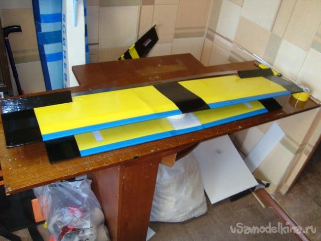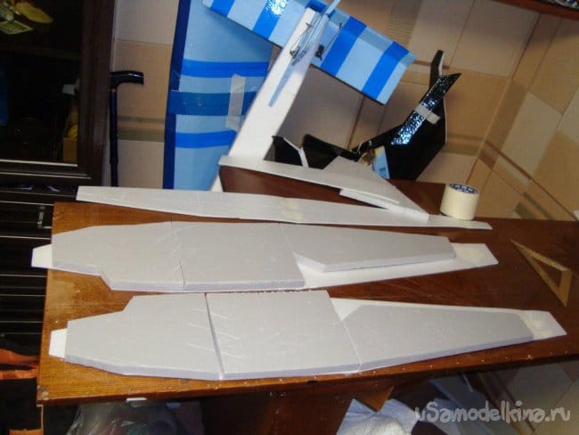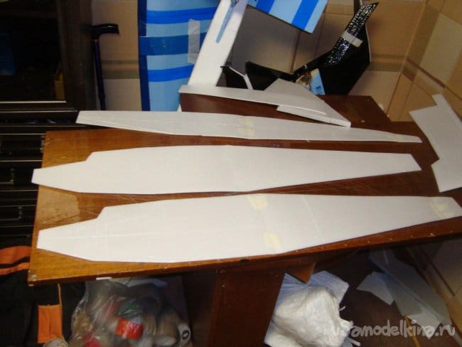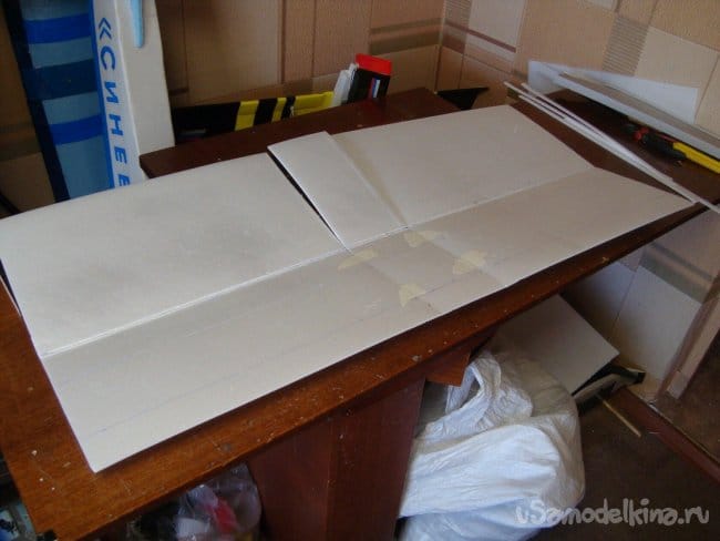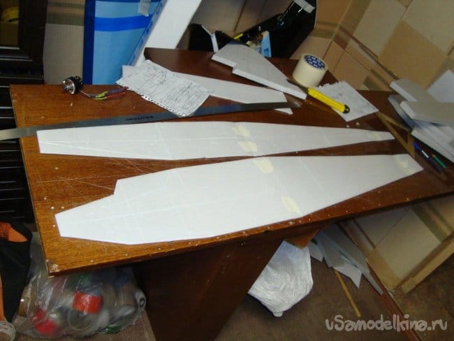 Вырезал заготовки для боковых стенок фюзеляжа, усилил их изнутри пластинами листового утеплителя «Пеноплекс». Так же вырезал нижнюю плоскость фюзеляжа.