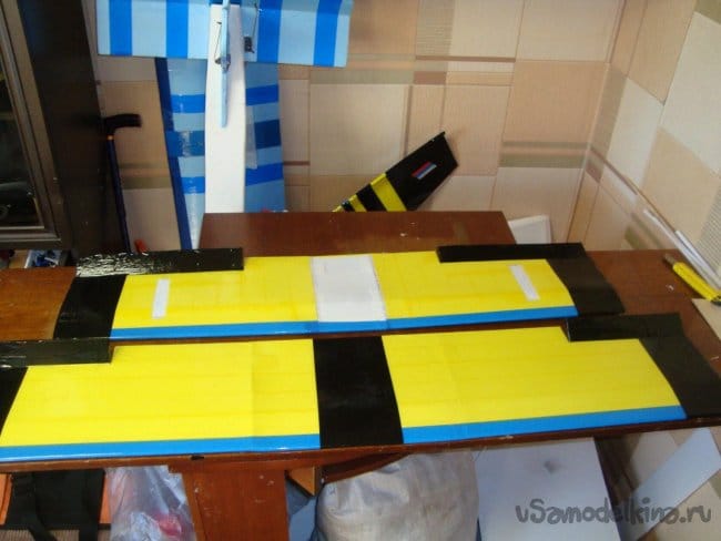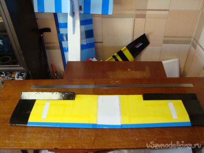Вырезал на крыльях элероны, навесил их на бумажный , малярный скотч, шириной 70 мм. и сразу обтянул цветным скотчем. Все рули можно навешивать на простой скотч, но я решил перестраховаться.