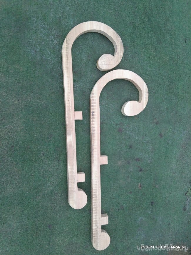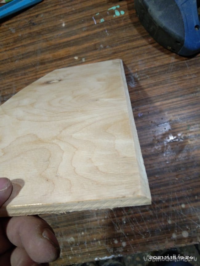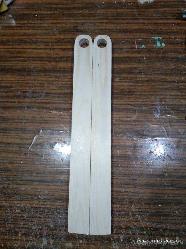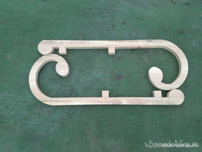 Пришлось искать другое решение. На Авито наткнулся на объявление о продаже дров от разобранного строения. Там я и нашел широкую сосновую доску, 34-37 см, толщиной 3 см. Из нее и сделал полозья такой формы, какая мне понравилась. В процессе работы кое-какие изъяны в древесине залил эпоксидной смолой. Хотел по краям обеих заготовок пройтись фрезером, снять фаску. Но так как дерево оказалось слишком мягким, фреза оставляла после себя не гладкую поверхность, а волокнистые обрывки. Пришлось отказаться от этой идеи и в дальнейшем все неровности убирать либо вручную, либо шлифовальной машинкой.