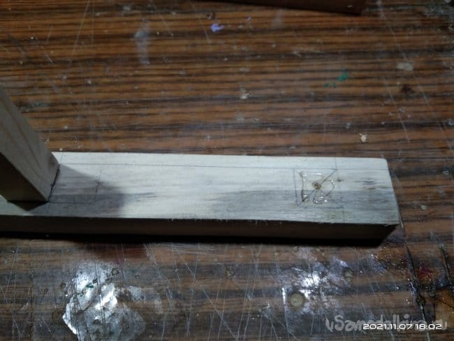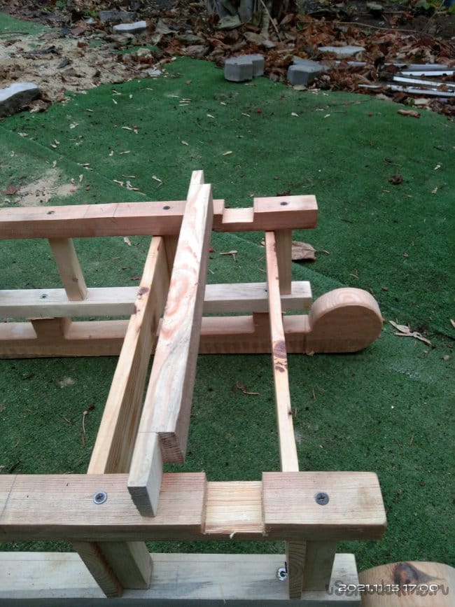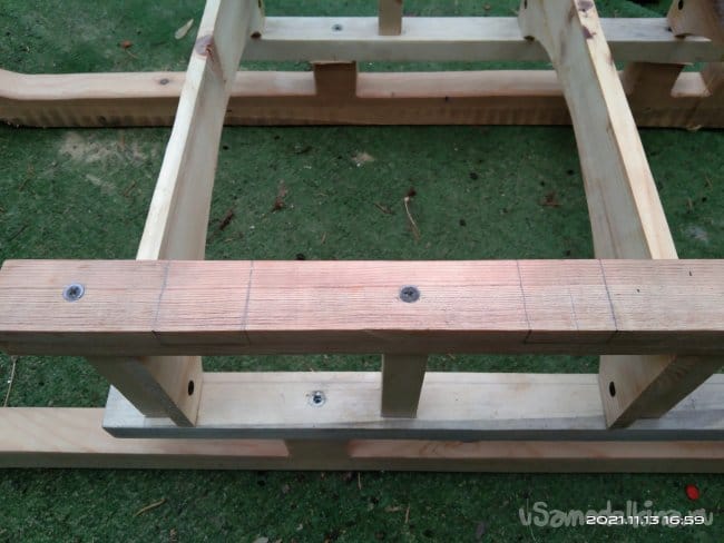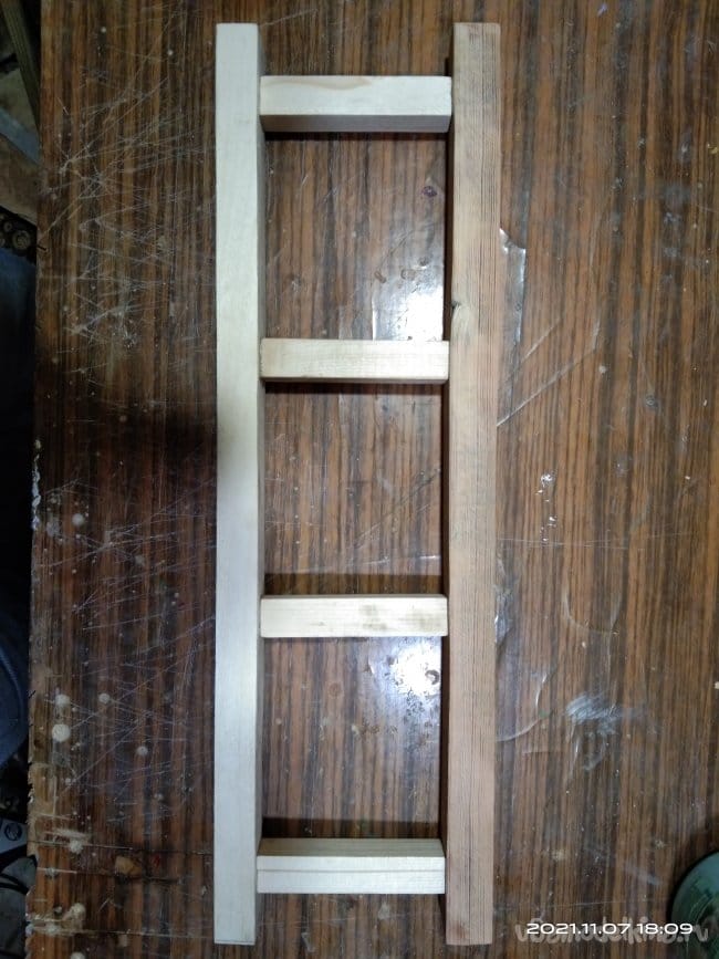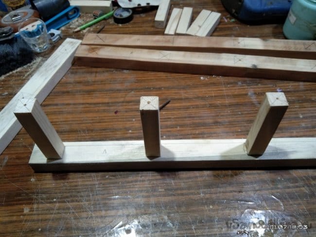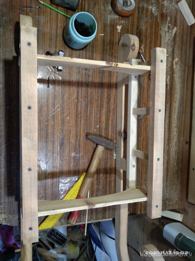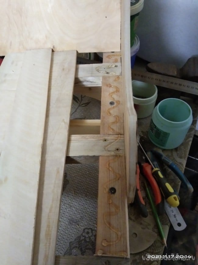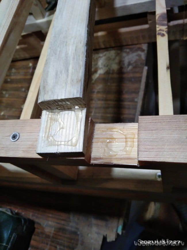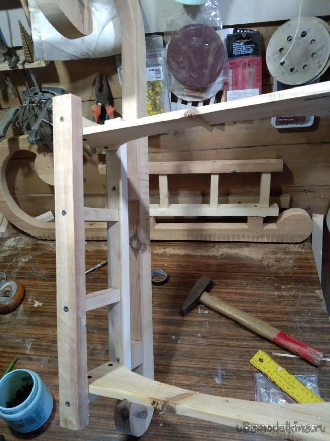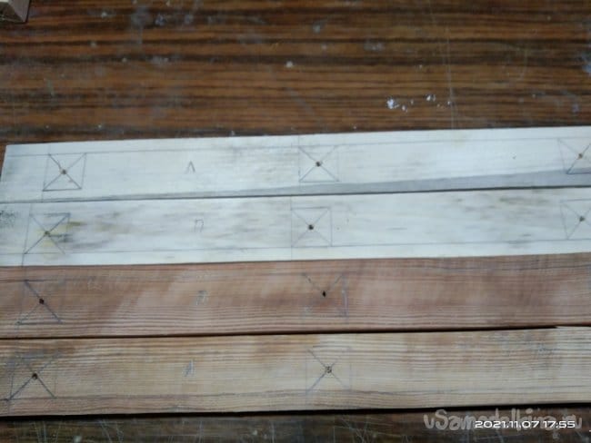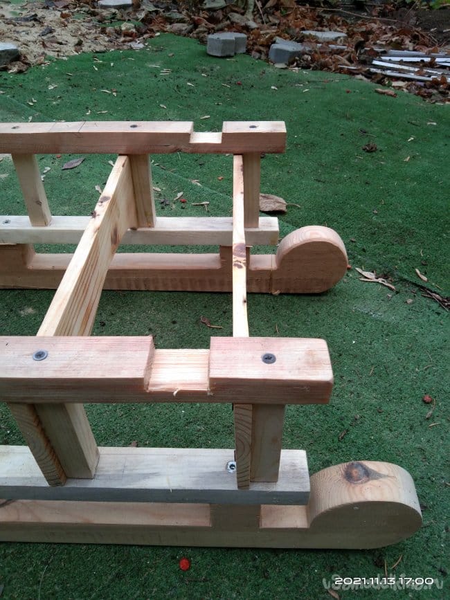 Следующий этап — это наращивание стенок полозьев, для того, чтобы имелась возможность установить на них сиденье санок. Для этого на циркулярной пиле были нарезаны бруски размером 30*30 мм. Их нужно 4 штуки, по два с каждой стороны. Так же сделал 8 брусков, необходимых для дальнейшей работы. Чтобы собрать все это воедино, делаю разметку для отверстий. высверлить их необходимо очень ровно, чтобы в процессе вкручивания саморезов они не ушли в сторону и не получился перекос. Делал это с помощью сверлильного станка. Далее детали смазываю клеем и сильно прижимаю друг к другу. Это особенность этого клея. Чтобы склеиваемые детали сцепились между собой нужно сильно прижать. Важное значение имеет именно сила, а не время ее воздействия на заготовки. Затем в заготовки через высверленные заранее отверстия закручиваю саморезы. Получаются две детали, напоминающие лестницу. Во время распиловки заготовок, обратил внимание на интересную особенность древесины. Практически все санки сделаны из сосны. Дерево хорошо просушенное, не мокрое. Но вот детали сделанные из сосны, но от разных заготовок, досок с которых они напилены, различаются не только по цвету, но и по весу и плотности. На фото они более темного, благородного оттенка. Почему так?