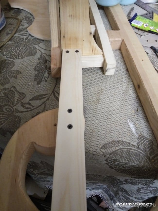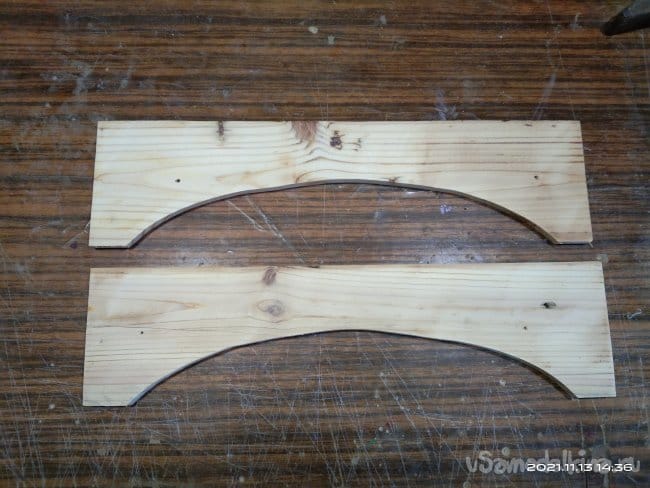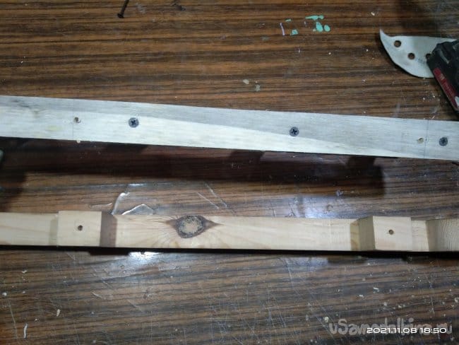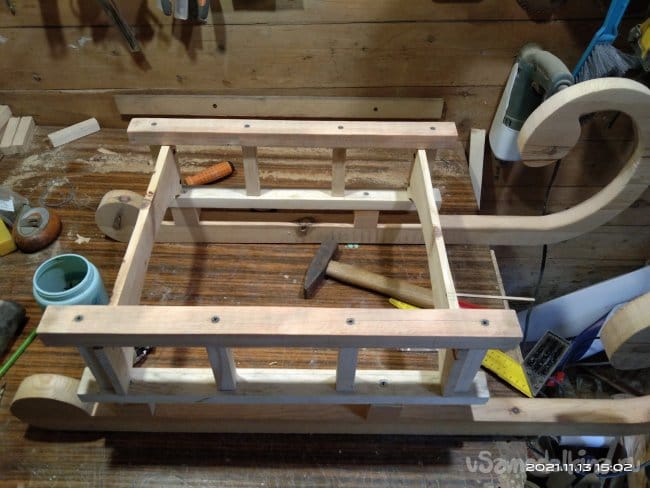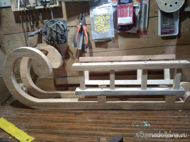 Полученные детали необходимо соединить между собой. Для этого я сделал три заготовки, ширина которых равняется высоте между направляющими стенок полозьев. Для того чтобы во время использования готового изделия нижняя часть санок не загребала снег, в заготовках выпилил полукруглые выемки. Так повысится высота от полозьев до заготовок, что повысит вероятность того, что снег не будет застревать под нижней частью санок. Детали изготовлены из доски толщиной 10мм. Чтобы выпилить заготовки максимально одинаковыми, доску разделил на несколько частей, которые скрепил между собой. На верхней заготовке нанес разметку и электрическим лобзиком выпилил по контуру. Полотно использовал для фигурного реза. Оно более тонкое и при работе с ним края заготовки по которым проходит пилка имеют более ровный рез, с минимальным количеством заусенций и задиров. Далее на этих заготовках отмечаю места крепления к стенкам полозьев. Шуруповертом высверливаю сквозные отверстия. Наношу клей и закручиваю детали на положенные им места. В этом случае клей использую обычный столярный, на основе ПВА. Саморезы подожмут заготовки как струбцины и клей намертво склеит детали, придавая дополнительную прочность креплениям. И все же этих поперечных деталей очень мало для надежного соединения двух половин санок. Поэтому в верхних частях опорных частей полозьев, их стенок, делаю пазы для еще одних поперечных перекладин, которые будут служить еще и для того, чтобы на них был установлен настил, т.е. место чтобы сидеть. Делаю разметку. Чтобы пропил получился ровным использую пилу по металлу. Сбоку от места предполагаемого пропила устанавливаю направляющую, обычный ровный брусок, который зафиксировал струбциной. С его помощью, приставив к нему полотно пилы, делаю надпилы в нужных местах. Стамеской выбираю ненужное. Так же делаю пропил и в поперечных брусках, которые установлю в пазы на стенках. Пазы и выемки промазываю клеем и саморезами стягиваю. После высыхания основа санок стала достаточно прочной.