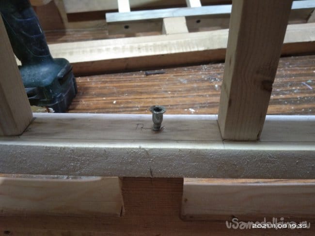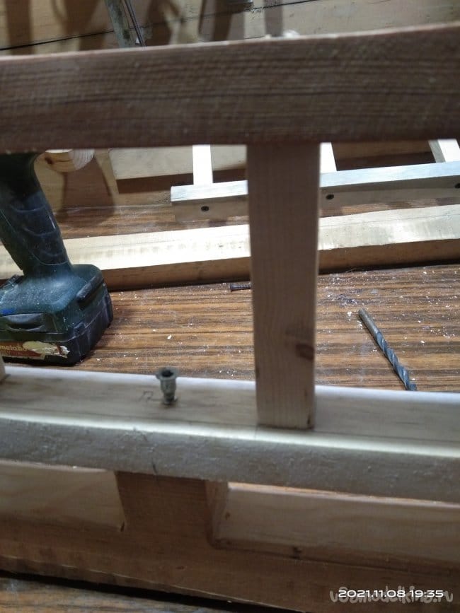 Теперь необходимо данные стенки установить на полозья. Для этого на них есть специальные места, к которым и будем крепить стенки. Размечаю в каких именно местах на стенках будет крепление, делаю сквозные отверстия. Т.к. отверткой подлезть невозможно, маленькое расстояние между деталями, использую мебельные евровинты. С помощью специального шестигранного ключа устанавливаю детали на свои места. На них я предварительно так же