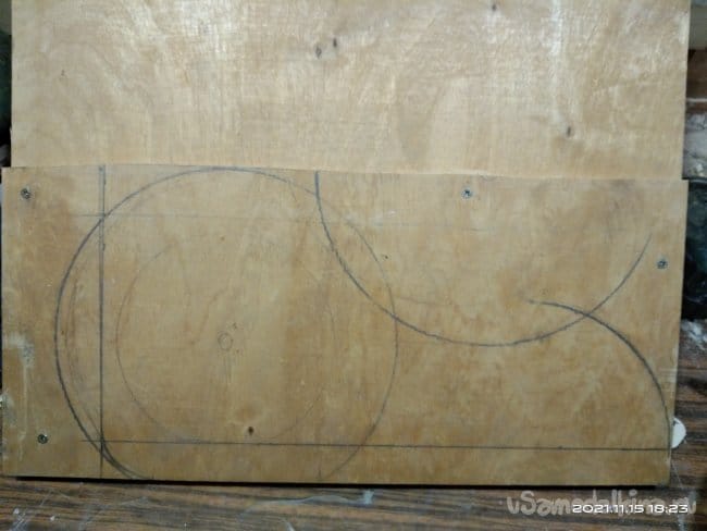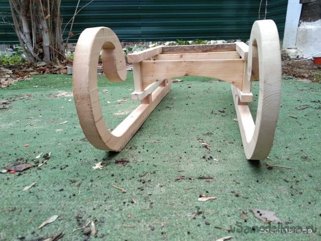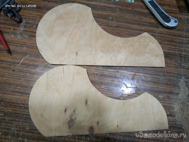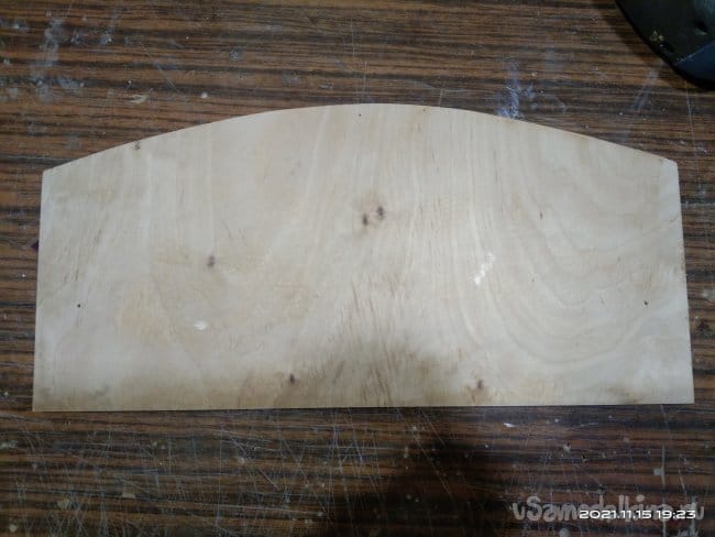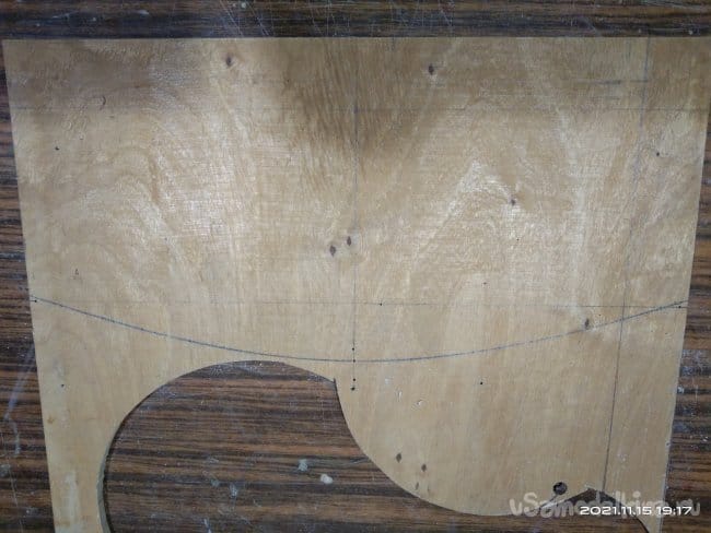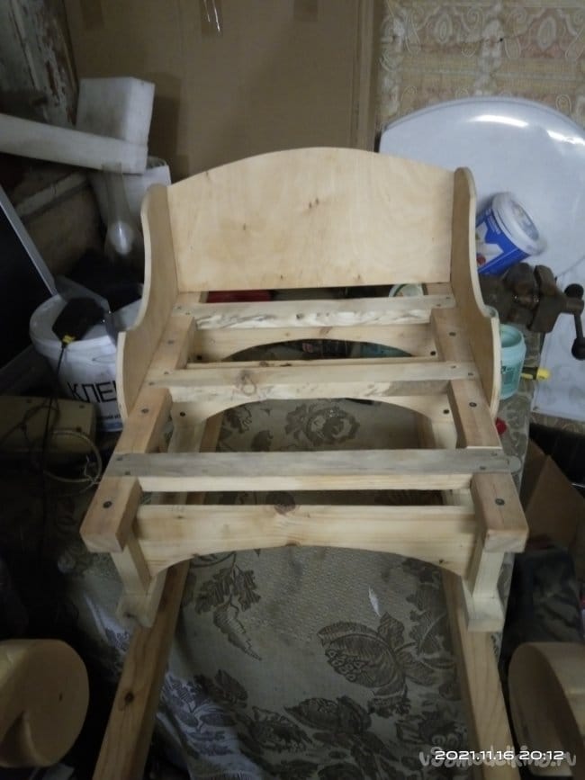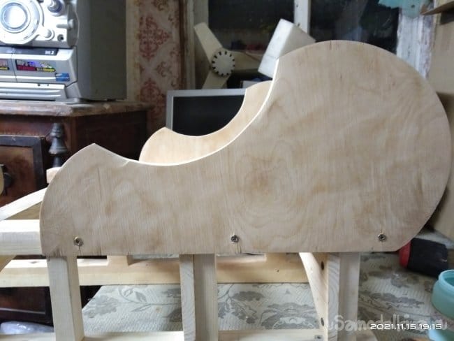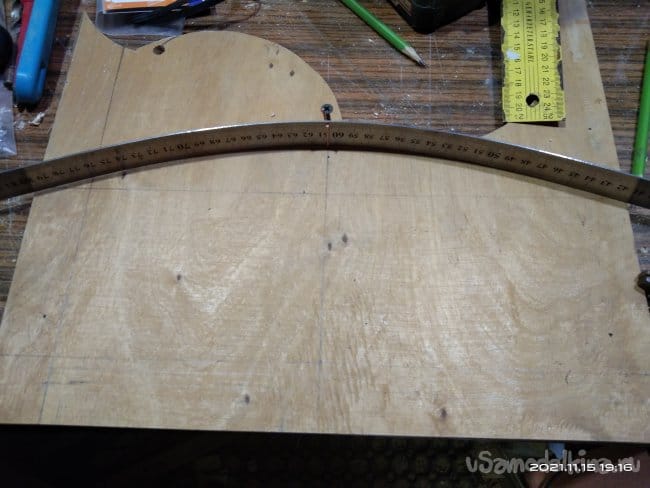 Теперь необходимо сделать на санки посадочное место, а так же борта и заднюю спинку, чтобы ребенку было удобно сидеть. Для бортиков и спинки была использована фанера толщиной 10 мм. Циркулем начертил форму бортиков и скрепив заготовки между собой приступил к выпиливанию. Спинке придал полукруглую форму. Чтобы этого добиться была использована металлическая метровая линейка. В нижней части спинки болгаркой с лепестковым диском придал небольшой угол наклона, чтобы как можно плотнее было прилегание к основе санок. И бортики, и саму спинку крепил просто на саморезы, не приклеивая детали к основе. Так что все это можно легко снять если возникнет такая необходимость. Все хорошо зашлифовывается, чтобы не поранить руки и не было заноз.