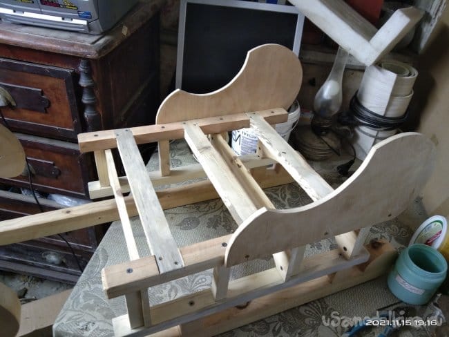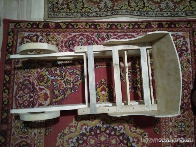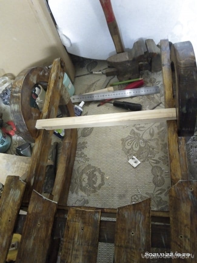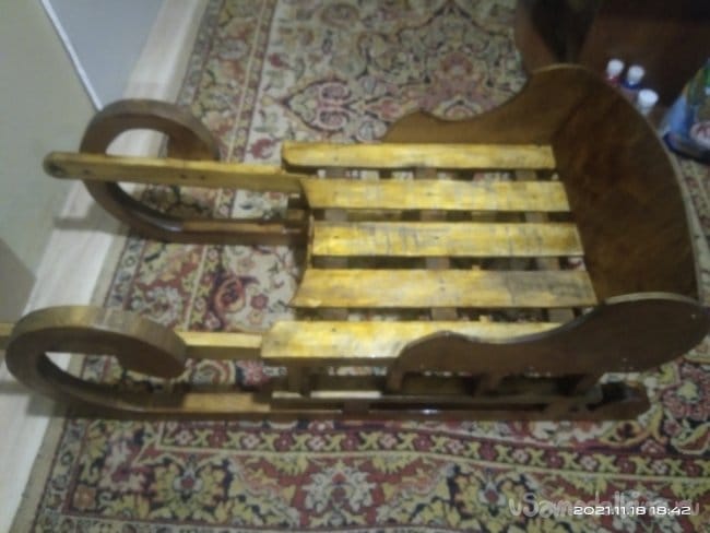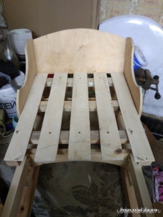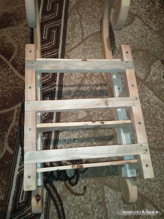 Настил для санок делал из дощечек от фруктово-овощных ящиков, которые были в избытке набраны на рынках города. Выбирал только те, у которых не было каких-либо изъянов и достаточная толщина. Досочки были отшлифованы и наживлены на места. На них была сделана разметка, по которой доски были обрезаны в форме полумесяца. С такой формой сиденья на санки удобно и легко садился ребенок. Это говорю забегая немного вперед, когда санки проходили свою первую обкатку. Те части, которые прилегают к спинке, были отпилены под угол в 5 градусов. Так они плотно прилегают к задней части. Досочки сиденья крепил к санкам с помощью клея и саморезов, по несколько штук на каждую доску. Практически готовое изделие покрасил лаком цвета "ПАЛИСАНДР" в несколько слоев. С каждым нанесенным слоем изделие становилось темнее. При разном освещении цвет меняется, в зависимости от того, как оно падает на изделие. Смотрится достаточно интересно.