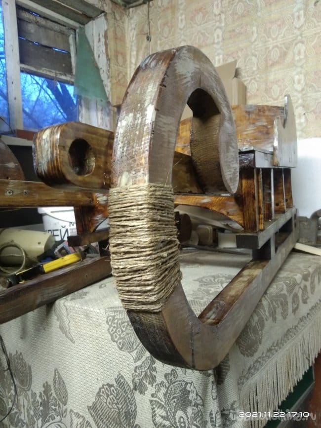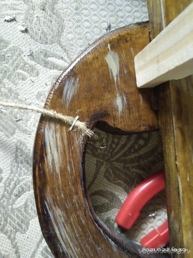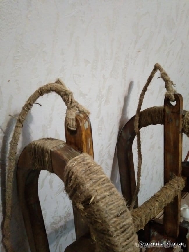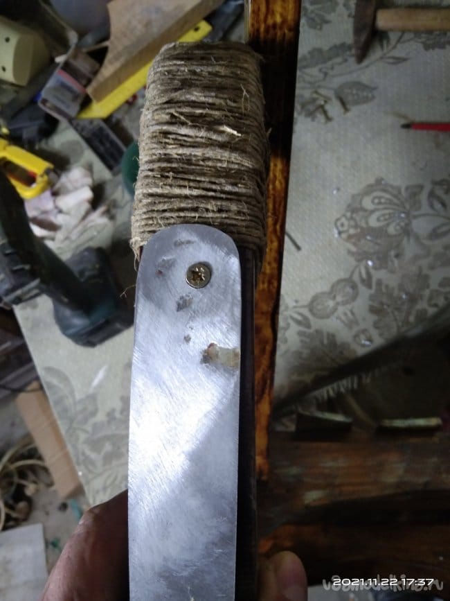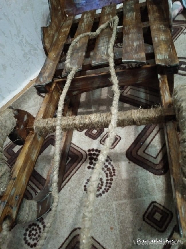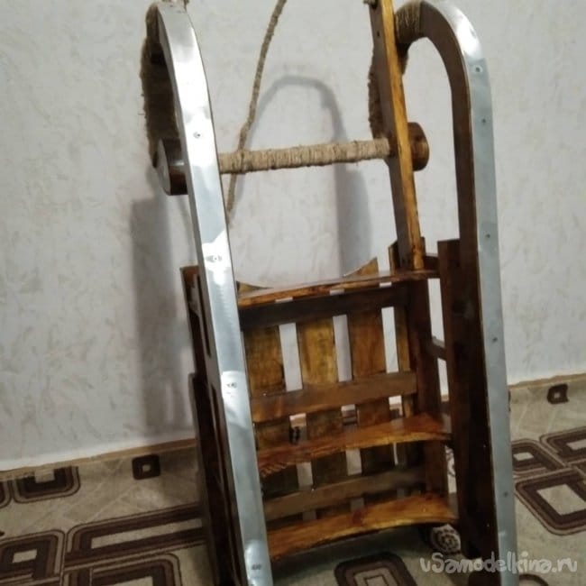 В процессе работы пришла мысль украсить изделие шпагатом, обмотав его вокруг верхней части полозьев. Для этой цели я использовал шпагат который продается практически в любом хозяйственном магазине. Его так же используют при подшивке документации. Строительным степлером закрепил конец нити на обматываемом участке полоза. Затем нанес клей по всему месту намотки шпагата, чтобы он впоследствии не сползал. Раз за разом, наматывая нить вокруг полозьев, убеждался что идея все таки стоящая. Вид менялся в лучшую стороны с каждым оборотом шпагата. После обмотки бесцветным клеем прошелся по всей обмотке. Так она не истрепается и не сползет. Далее было необходимо установить на нижнюю часть полозьев какую-нибудь полосу металла, чтобы дерево не портилось об снег и лег и санки лучше скользили. Изначально хотел сделать полосу из оцинкованного листа жести толщиной 0,75 мм., но в дальнейшем отказался от этой идеи. Слишком тонкий металл. Крепить его к дереву я хотел саморезами, а так как они должны быть вровень с металлом, т.е. шляпка самореза должна быть "заподлицо", этого бы достичь мне не удалось. Поэтому были использованы алюминиевые полосы. Они больше подходили для этого дела. В них были просверлены сквозные отверстия, а место под шляпку было раззенковано. Шляпка практически утопала в полосе металла. Таким образом полозья, нижняя их деревянная часть, была укреплена от воздействия силы трения об снег. Зател болгаркой с лепестковым диском сточил все неровности, в том числе и выступающие части шляпок саморезов. Установил перекладину для ног. Ее так же обмотал шпагатом, но уже более толстым. Работать им намного быстрее. Вместо клея использовал лак. Прокрасив перекладину и не дожидаясь пока лак высохнет, стал обматывать вокруг перекладины шпагат. После высыхания он держит обмотку не хуже клея. Этим же шпагатом обмотал и оставшуюся верхнюю часть полозьев. Веревку для этих санок тоже делал самостоятельно, т.к. ни одна из у меня имеющихся не подходила для них. Использовав все тот же толстый шпагат, благо у меня его несколько бобин. На противоположных стенах друг на против друга установил два крючка. На них намотал шпагат. Получилась толстая нитяная заготовка. Тот шпагат, который более тонкий, пустил на обмотку этой заготовки. В конечном итоге вышла такая веревка, которая была мне необходима. Она полностью вписалась в концепцию этих санок! Продев ее в ушки, закрепил тонким шпагатом.