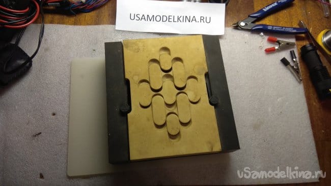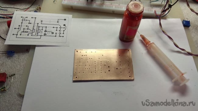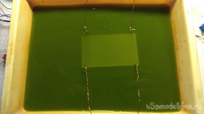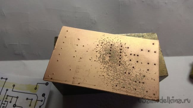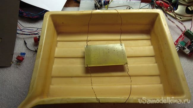 По углам платы всегда сверлю отверстия для подвешивания платы в кюветке на эмалированный провод. Фотопечатью уже давно никто не занимается, а кюветки остались, им уже больше сорока лет и до сих пор держатся. Из них очень удобно сливать раствор обратно в бутылку. Плату подвешиваю вниз фольгированным слоем, продукты реакции падают на дно кюветки, процесс идет быстрее.