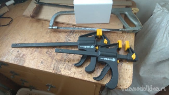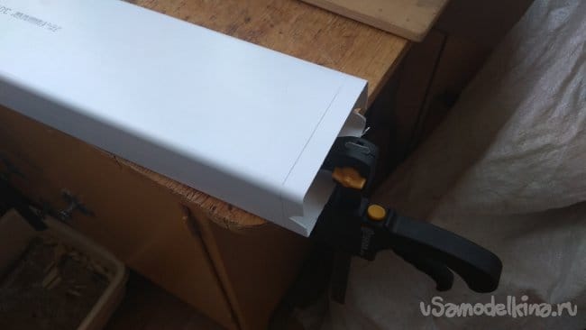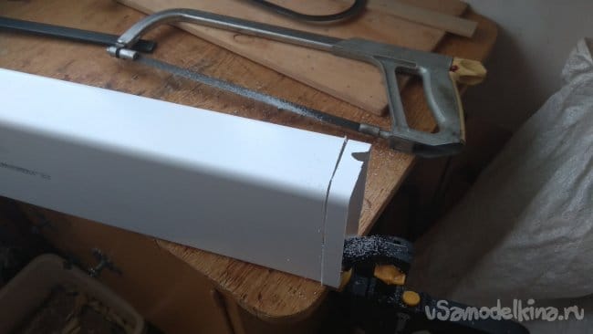 Отпилил от воздуховода отрезок нужной длины. Пластик хрупкий, пилил аккуратно ножовкой по металлу, закрепив воздуховод струбцинами к столу.