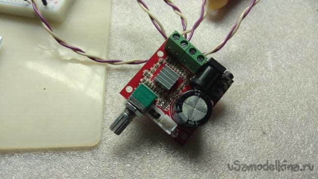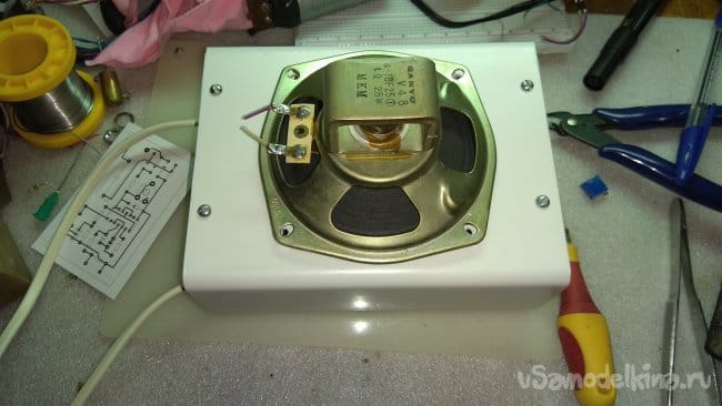 Собирал схему на макетной плате. Было несколько вариантов, выбрал самый лучший и простой. Попробовал разные динамики, выбрал тот, который больше. Разницы в звуке почти нет. Маленький не захотелось лишать пары, пригодится в других самоделках.