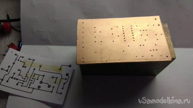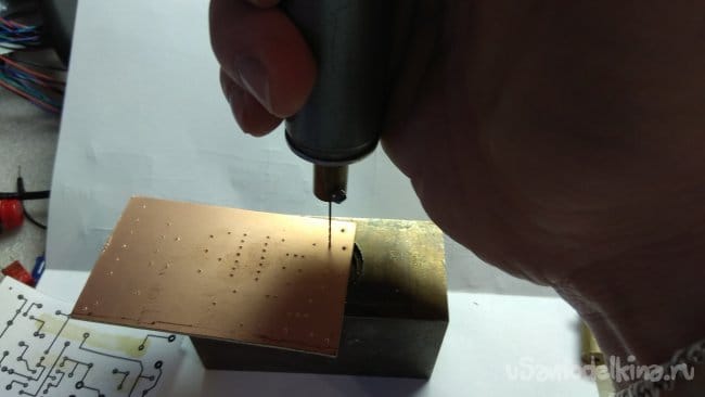 ЛУТ у меня как-то не прижилась, после прикатывания дорожки иногда получались толстоватыми, да и бумагу под ЛУТ надо не простую. Нарисую по старинке краской. Первым этапом всегда керню и сверлю отверстия. Это пошло с тех пор, когда приходилось разводить дорожки между ножками ИМС. При сверлении протравленной платы сверло может уйти немного в сторону, а если первым делом просверлить отверстия, то пяточки можно нарисовать точно по ним.