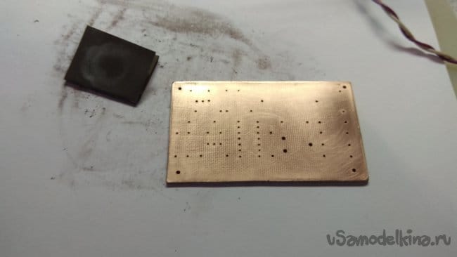 После сверления выравниваю отверстия молотком и зачищаю плату перед покраской мелкой наждачкой. Получаются аккуратные отверстия.