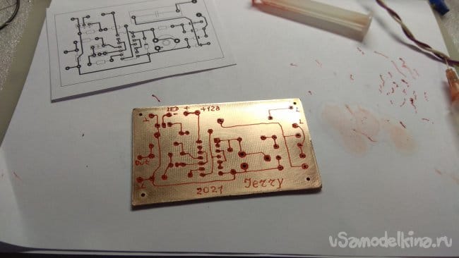 Рисую нитрокраской разведенной ацетоном до нужной вязкости. Для рисования использую шприц и тонкую инсулиновую иглу, согнутую для удобства под углом. Толщина дорожки получается около 0,6 мм, все зависит от вязкости краски. Для более толстых дорожек есть вторая игла.