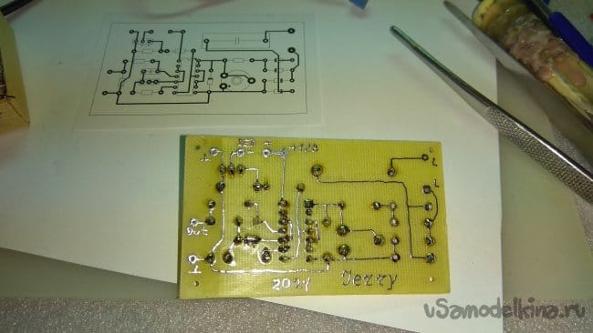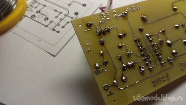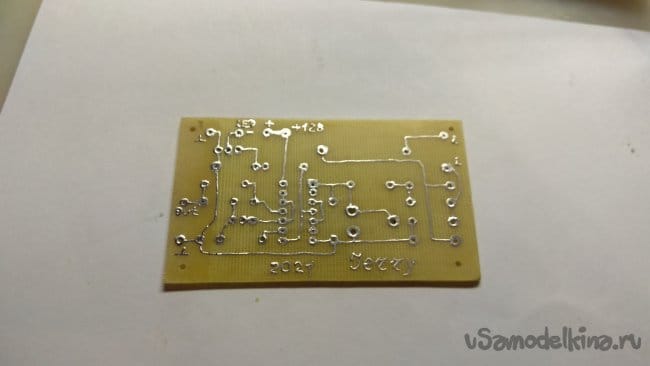 После травления плату мою под холодной водой, затем спиртом смываю краску. Зачищаю плату мелкой наждачкой, лужу припоем.