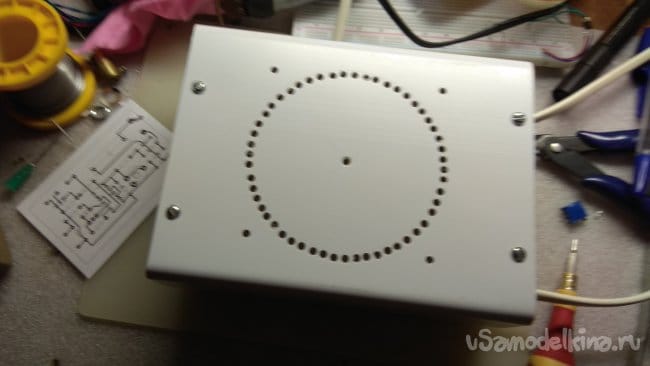 Хотел высверлить круг, а отверстие закрыть декоративной сеткой, но потом пришла мысль просто насверлить отверстий. Так получилось даже лучше и проще.