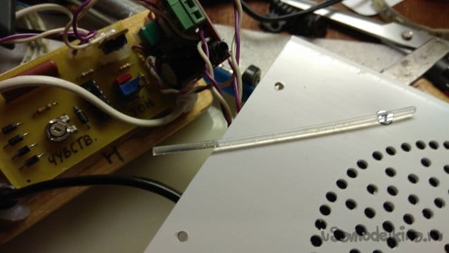 На плате усилителя есть светодиод индикации включения, решил использовать его, для индицирования включенного состояния. Просверлил в заглушке отверстие напротив светодиода на плате, для установки кусочка пластика в качестве световода.