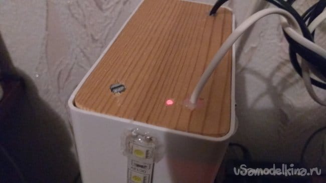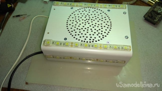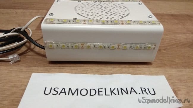 Займемся световой индикацией. Отрезал четыре куска светодиодной ленты и приклеил на корпус с трех сторон.