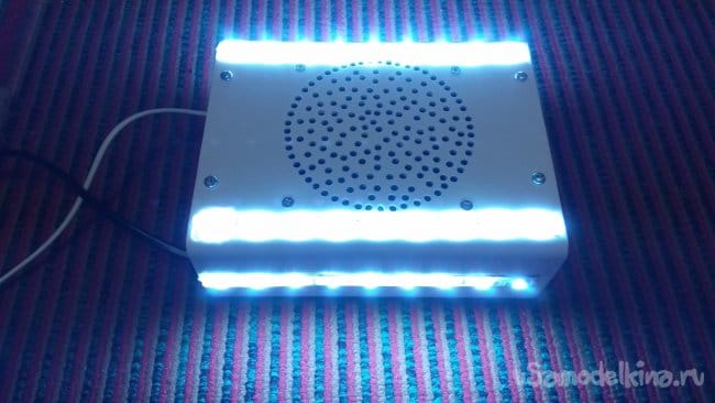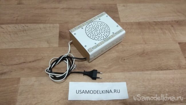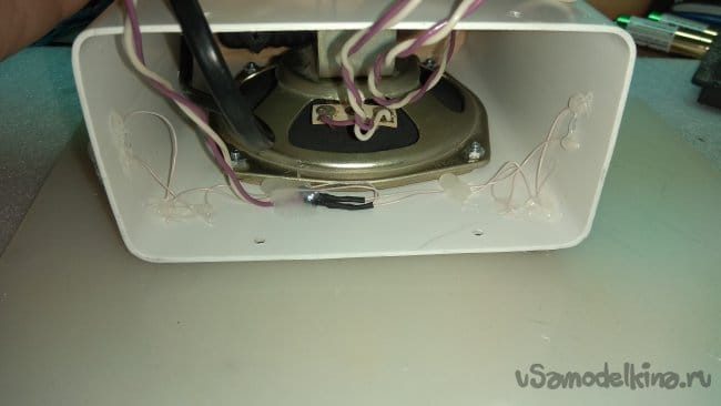 Адаптер блока питания я хотел разместить снаружи, но заказчик попросил спрятать его внутрь, в связи с ограничением места подключения в розетку. Разобрал блок питания, убрал сетевые контакты, которые могли упираться в динамик, но как впоследствии оказалось, не мешали, припаял провода. Приклеил адаптер термоклеем к боковой заглушке.