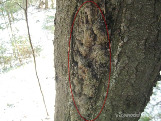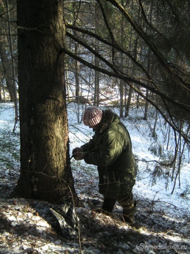 Заготовка, сбор живицы, в прошлом являлось значительного размера промыслом в лесных зонах – кору дерева частично снимали и собирали медленно стекающую смолистую массу которой дерево пыталось залечить рану. Процесс это длительный, в теплое время года счет идет на недели. Для своих экспериментов мы воспользовались способом несколько более сложным и затратным но куда как менее травматичным – находили в лесу старые хвойные деревья и затвердевшие потеки смолы на них. Такие образования есть почти на каждом старом дереве, обычно это залеченные трещины-морозобоины. Мы снимали только верхнюю часть смолистых наплывов стараясь не ковырять кору. Холодная и твердая смола на морозе почти не липнет и относительно легко откалывается крепким ножом.