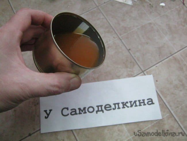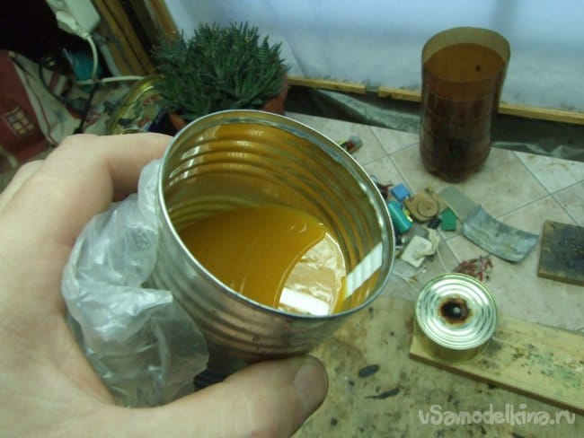 Смолистые вещества трудно отчищаются и отмываются, потому посуду предпочел жестяную но одноразовую – отмытые консервные баночки. Проволочная ручка позволяет не обжигать руки, хотя можно обойтись и без нее. Здесь многое горячее - удобно на нерабочую руку одеть хлопчатобумажную перчатку, вторая главная свободна, остается для тонких операций.
