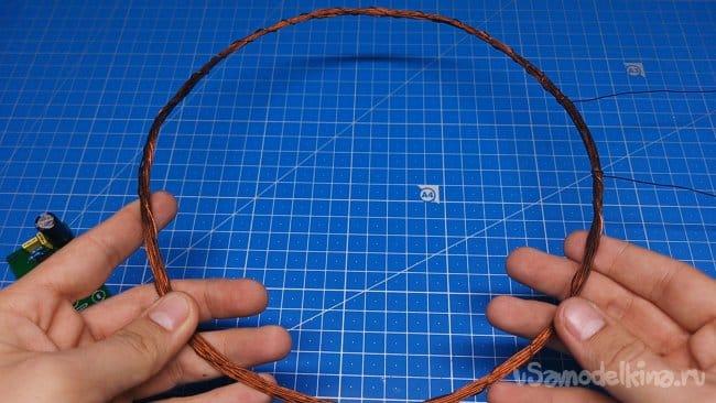 Сейчас мотаем катушку, да именно сейчас мотаем, не в самом конце. Моя катушка намотана одножильным медным проводом 0.8 мм. Диаметр катушки чуть меньше 20см. Количество витков 20, сопротивление катушки 1Ом.