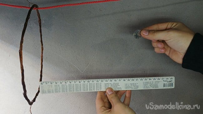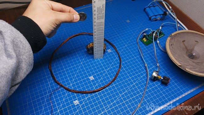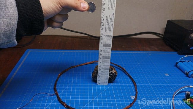 Проверяем схему. Я взял монетку 2 гривны и потихоньку подносил к катушке. Ну и где-то на расстоянии 13см металлоискатель увидел эту монетку.
