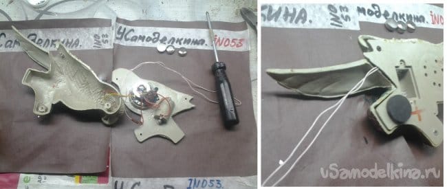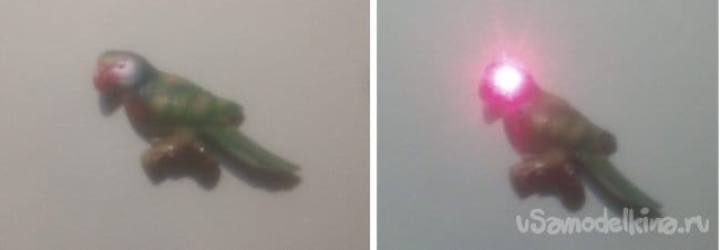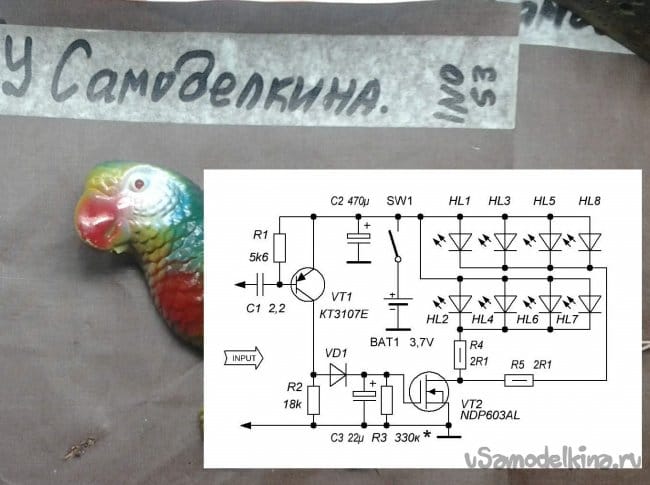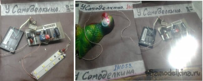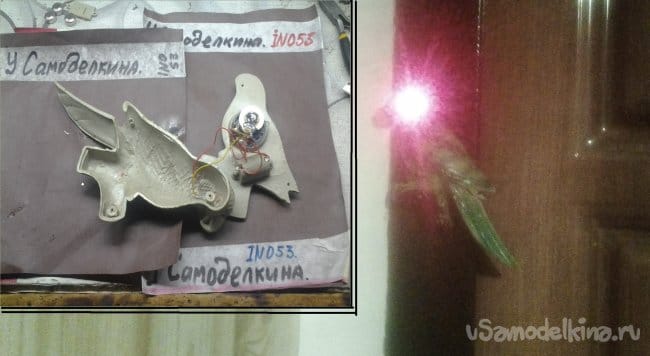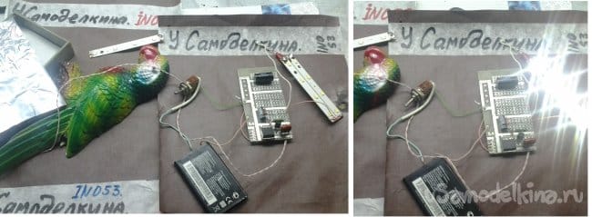 Динамик в попугае он, естественно, отключил, но света от индикаторного светодиода, да еще мигающего, оказалось мало. Тут он обратился ко мне. Рассмотрев толком и обсудив этого попугая, решили, что на светильник он никак не тянет даже при замене светодиода с красного на белый, а вот как акустический датчик для запуска внешнего устройства – вполне.