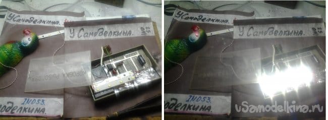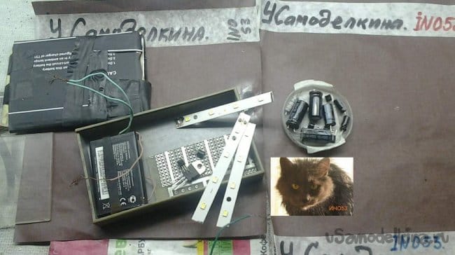 Аккумуляторы для пробы взяли от какого-то планшета и мобильников, из какого-то светильника – светодиодные полоски, там по четыре светодиода параллельно, остальное тоже все нашлось, как говорится, не отходя от кассы.