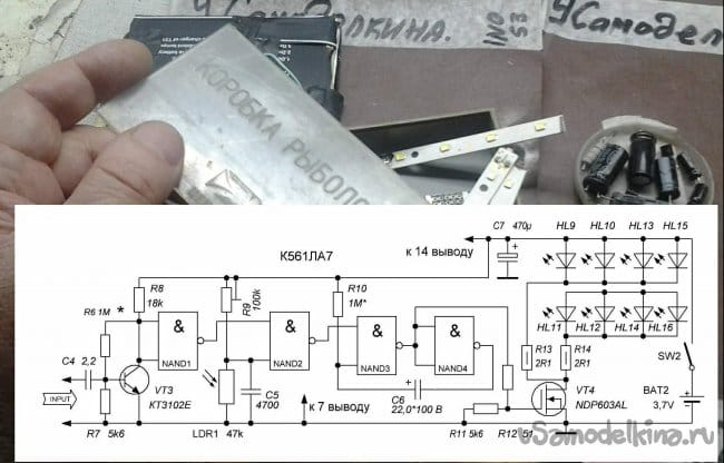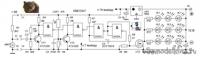 Светодиоды, ключ и питание использованы от предыдущей конструкции. Основа схемы – интегральная КМОП микросхема К561ЛА7, содержащая четыре логических элемента 2И-НЕ (NAND). Транзистор служит для усиления сигнала, полученного от попугая, с помощью резистора R6 он настраивается так, чтобы на коллекторе было примерно 2/3 напряжения питания, т.е. логическая «1». При появлении сигнала от попугая на коллекторе транзистора хотя бы кратковременно выскакивает логический «0» (т.е. уровень меньше 1/3 напряжения питания), который, пройдя две инверсии и формирование элементами NAND1 и NAND2, запускает одновибратор на элементах NAND3, NAND4, конденсаторе С6 и резисторе R10. Выходным сигналом полевик VT4 открывается, и, пока одновибратор отрабатывает свое время - примерно 20…30 сек., светодиоды светят, причем довольно ярко – суммарный ток получился больше, чем 0,5 А. По окончании этого времени светодиоды гаснут, но цикл можно перезапустить, громко ругнувшись. Это возможно только в темноте, т.к. при повышении освещенности свыше определенного уровня фоторезистор LDR1 снижает свое сопротивление настолько, что на подключенном к нему входе элемента NAND2 появляется логический «0», этот элемент блокируется и перестает пропускать через себя входящий сигнал.