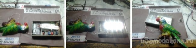 Попросил соседский парнишка (о нем я писал в статье «Фонарик. Первая работа») помочь ему в изготовлении небольшого электронного устройства. Дело в том, что в нашем доме на каждом этаже двери в две квартиры из четырех расположены в глубине небольшого коридорчика, и, если там свет не включить заранее, то в темное время суток добираться от лифта до выключателя приходится чуть ли не на ощупь. А у соседа на холодильнике висел на магнитике привезенный откуда-то сувенир – попугай, который на громкие и не очень звуки реагировал противной якобы птичьей трелью и еще мигал красным светодиодным глазом.