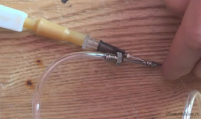 Через толстую иглу должен проходить газ. Для его подачи подсоединяем к трубке газовый баллончик: