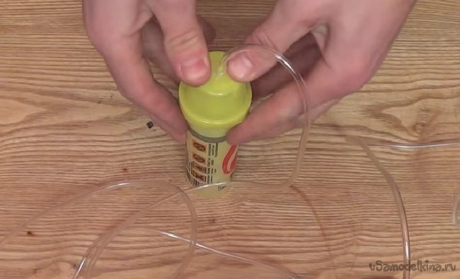 Второй шланг цепляем к компрессору для подачи сжатого воздуха. Если компрессора нет, то можно создать давление внутри обычной пластиковой бутылки при помощи ручного насоса.