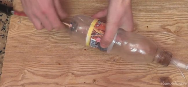 В задней части бутылки также делаем отверстие и вводим в него трубку. Для герметичности места соединений тщательно проклеивываем, затем уже можно тестировать наш "компрессор":