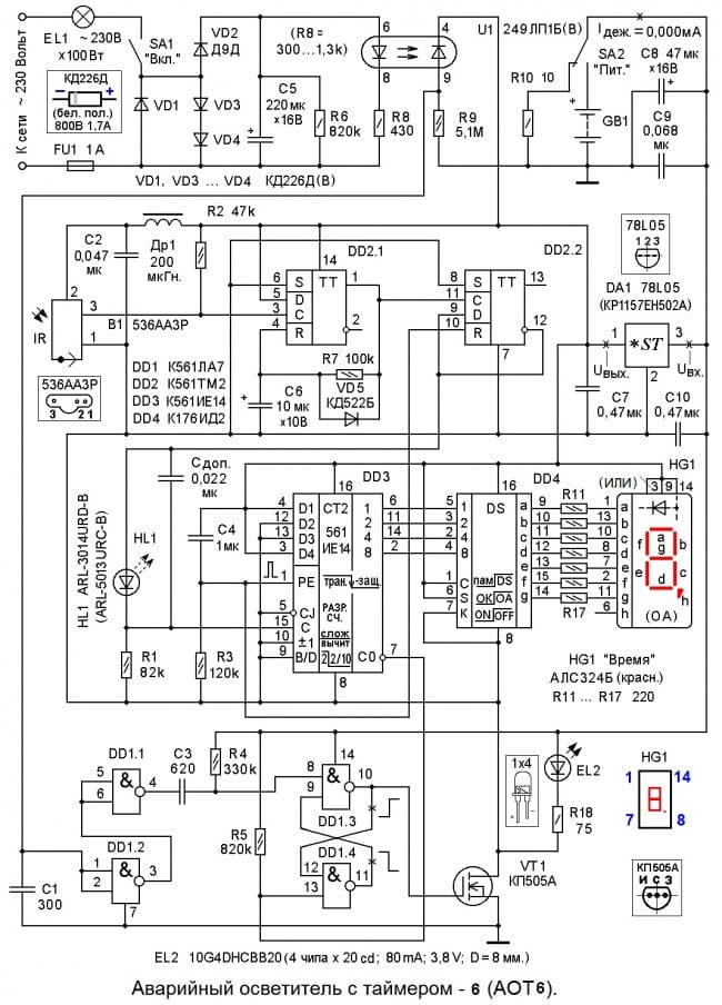 Аварийный осветитель с таймером - 6 (далее просто АОТ6) представляет собой конструкцию, использующую датчик сетевого тока, выполненный на силовых выпрямительных диодах, и имеющую оптронную гальваническую развязку от сети ~ 230 Вольт. АОТ6 срабатывает при аварийном и безаварийном отключениях сетевого (~ 230 Вольт) напряжения. Одновременно АОТ6 выполняет функцию «задержки выключения освещения» (кратковременного дублирующего освещения), исключая потенциально опасные (для здоровья пользователя и для окружающих) действия в темноте, после выключения освещения в комнате.