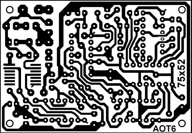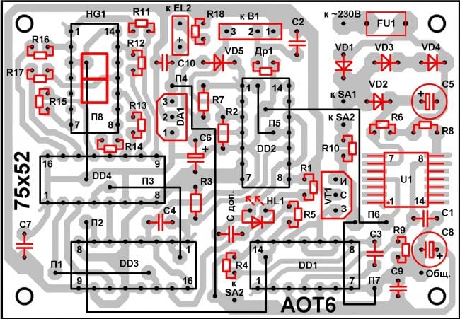 Печатная плата (далее просто ПП) АОТ6 выполнена из односторонне фольгированного стеклотекстолита размерами 75 х 52 х 2 мм (см. рисунки 2 и 3).