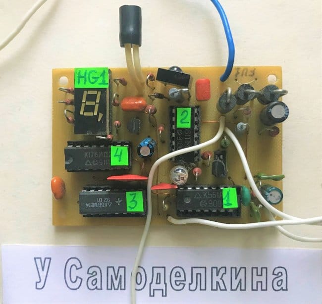 В исходном состоянии на выходе (выводе 1) ИК - приёмника B1 536AA3P установлен высокий уровень напряжения (лог.1). Для остановки таймера, ИК ПДУ направляют на корпус ИК - приёмника B1. Угол наведения ПДУ на В1 не критичен, так как при небольшом расстоянии ИК ПДУ от В1, ИК-приёмник В1 может успешно «реагировать» и на отражённые от стен и потолка ИК - лучи. Однако при больших расстояниях от ИК ПДУ до ИК-приёмника В1 - для надёжного переключения триггера DD2 - следует «прицеливаться» поточнее.