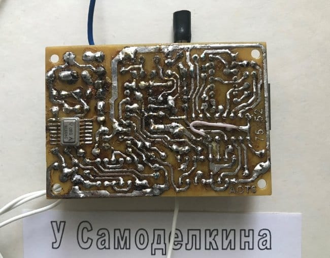 Перед установкой деталей на печатную плату следует впаять 8 перемычек из одножильного провода в термостойкой изоляции. Полевой транзистор и микросхемы желательно установить на специальные розетки с шагом между выводами 2,5 мм. (для защиты от статики) по окончании пайки всех остальных деталей.
