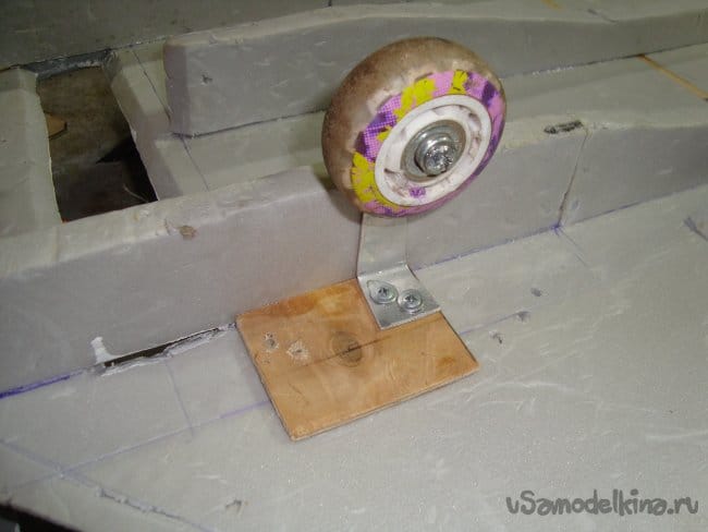 Вместо колёс приспособил ролики от старых роликовых коньков. Немного тяжеловаты, но зато на подшипниках и очень прочные, а добавленный вес компенсируется большой тягой мотора