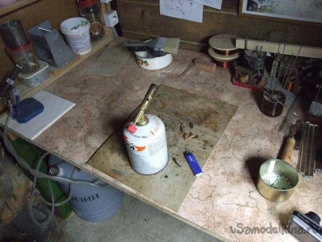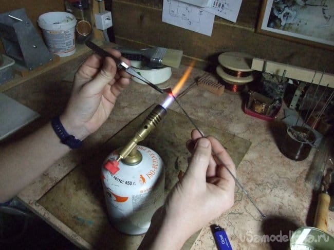 Здесь нужно крупное «мягкое» пламя, удобно когда в нем все таки присутствуют более-менее выраженные зоны горения. Если имеющаяся горелка недостаточно мощная, можно объединить несколько, направив их факелы навстречу друг другу, работа с такой «американской» горелкой еще удобнее. В работе применена небольшая газовая «паяльная лампа» накручивающаяся на стандартный баллончик для туристического оборудования (Фото 2), баллон заправлен пропаном из большого бытового.