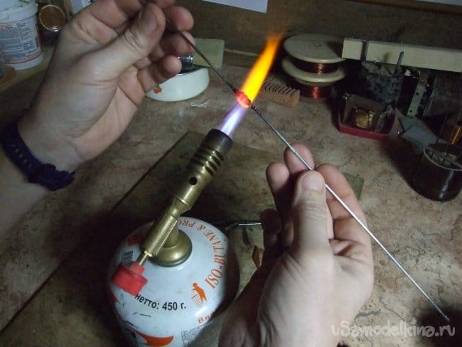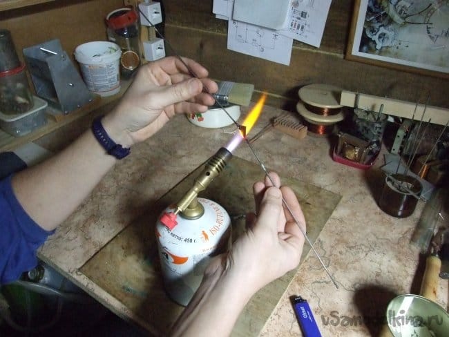 Здесь мы используем спицы-державки – по две одновременно. Для непрерывного процесса мне понадобилось шесть спиц – при этом последняя пара успевает остыть и стекло – готовая струна от них отваливается, можно использовать для изготовления следующей. Хорошие державки-спицы удобно сделать из сварочных электродов «по нержавейке», сбив обмазку и отшлифовав наждачной бумагой с некрупным зерном. Такие электроды по сравнению с обычными дороги и часто продаются на вес или вовсе поштучно, они ровные, можно подобрать удобный диаметр, приобрести малое количество.