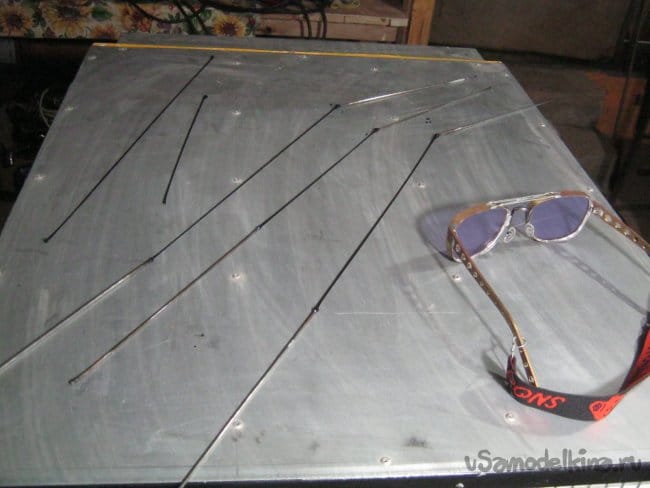 Готовую струну с прилипшими стальными ручками-спицами кладем остывать на плоскую несгораемую поверхность (Фото 10). Минут через пять металлические спицы отваливаются от стекла самостоятельно или при небольшом усилии. Остатки стекла на концах спиц при необходимости можно сбить молотком на стальной плите или сколоть плоскогубцами.