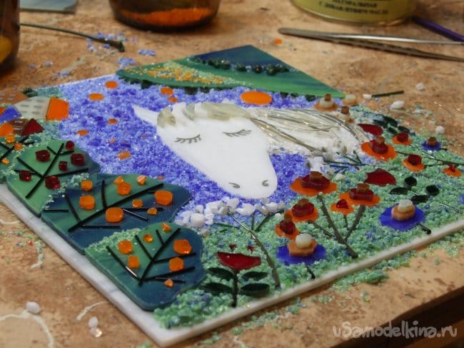 Мы используем стеклянные струны только как заготовки для своих стеклянных работ в технике фьюзинг. Длинные струны без труда накалываются на нужного размера кусочки обычными торцевыми кусачками. Работать со струнами куда как сложнее чем с краской но оно того стоит. Например, например.