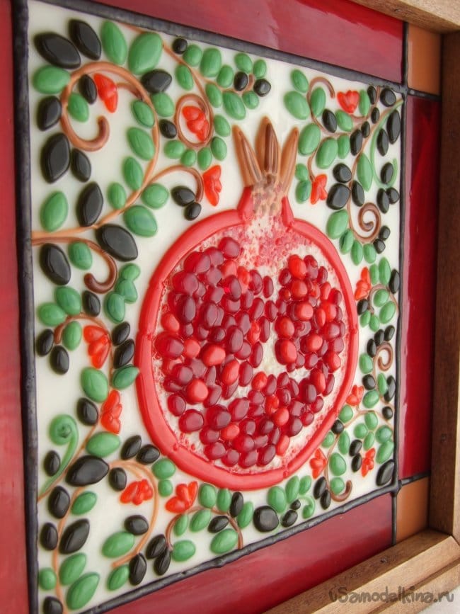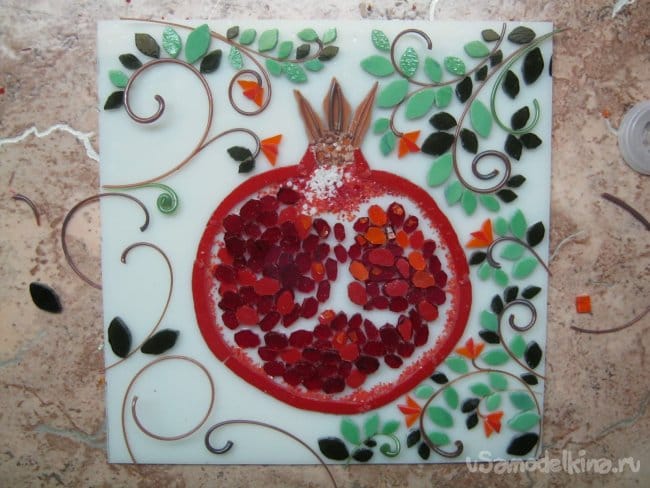 Фото 16. Панно с гранатом. Используются в том числе и детали – стеклянные, сформованные вручную кривые из струн.