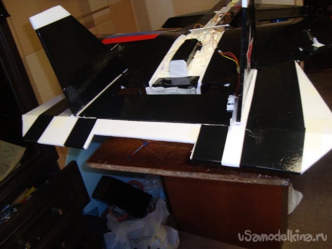 В крыльях вырезал элероны, навесил на бумажный, малярный скотч, с последующей обтяжкой чёрным скотчем.