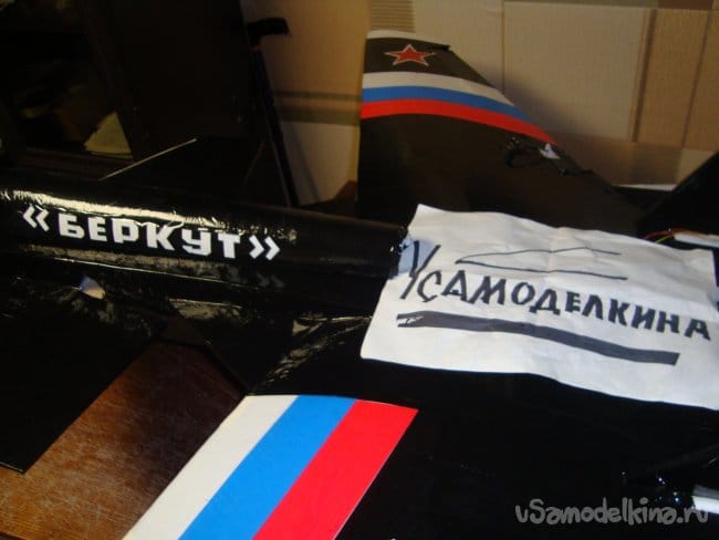 Закончил обтяжку модели цветным скотчем, смонтировал сервомашинки на ПГО и элероны. Вклеил кабанчики, подсоединил тяги. Модель готова.