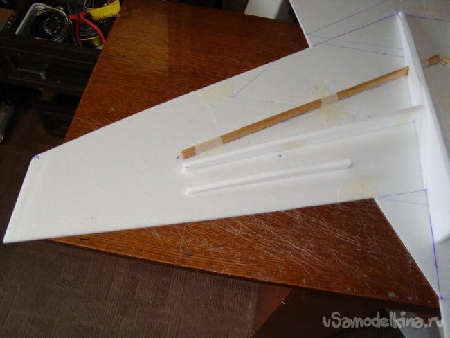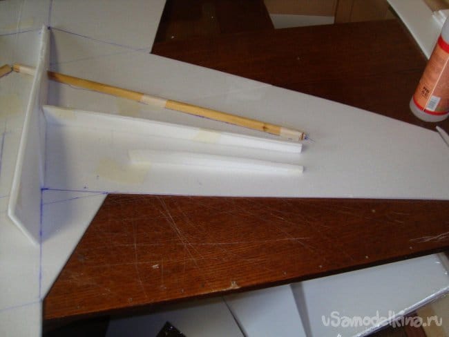 Решил объединить правую и левую части и сделать одну управляющую плоскость РВ. Для этого вклеил обрезок деревянной, ученической линейки.