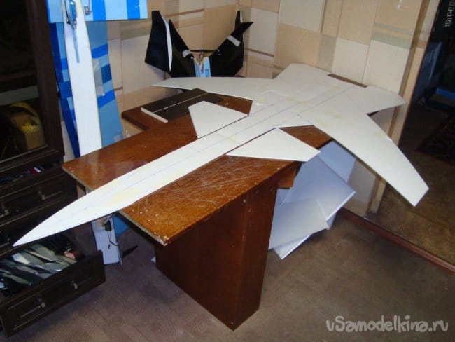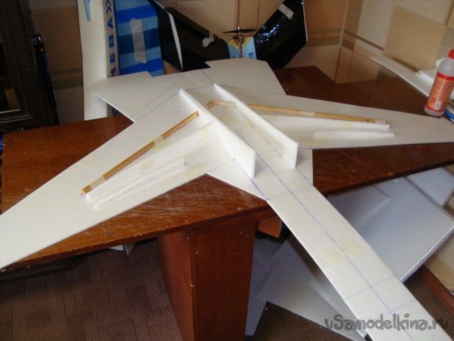 На эту плоскость приклеил деревянные рейки, для обеспечения достаточной прочности крыльев , вклеил лонжероны, вырезанные из потолочки , и вклеил боковые , внутренние стенки фюзеляжа.
