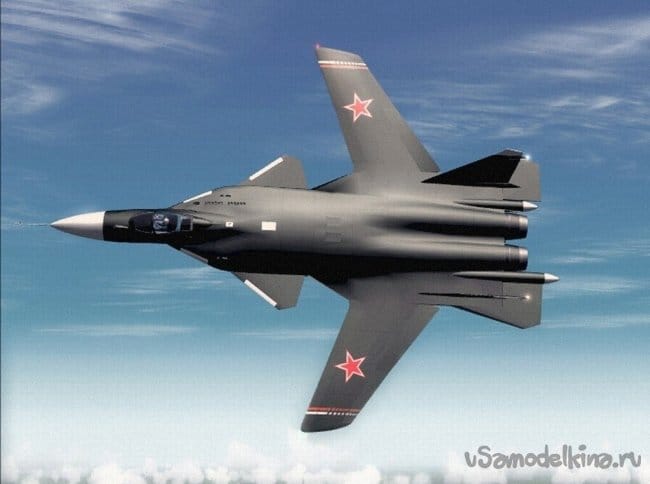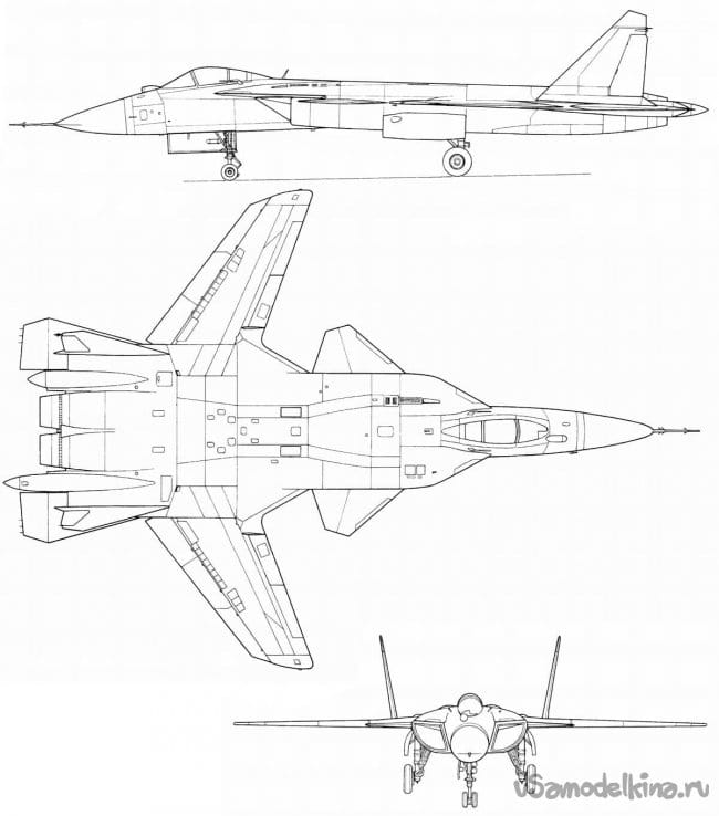 Глядя на эти фотографии и используя чертежи самолёта Су- 47 «Беркут», я сделал свой рисунок модели.Без воздухозаборников модель получилась более изящной. Хотя можно было сделать носовую часть фюзеляжа ещё более утончённой, "лёгкой". Но об этом я подумал, когда модель была уже сделана.