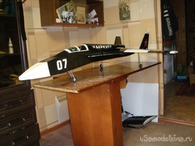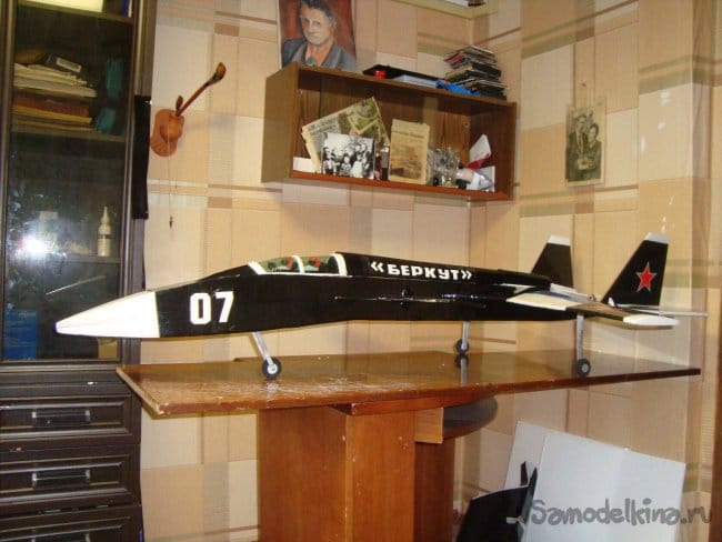 Эта кордовая модель не копия самолёта Су-47 "Беркут", а упрощённый вариант, в котором отсутствуют воздухозаборники, которые создают определённые трудности как при изготовлении модели, так и , в значительной степени уменьшают аэродинамические качества, создавая лишнее лобовое сопротивление.